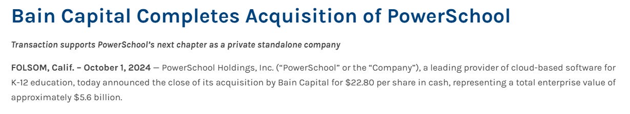 Here is the detail the press releases missed. In October 2024—right in the middle of that three-month window—Bain Capital finalized its $5.6 billion acquisition of PowerSchool.